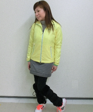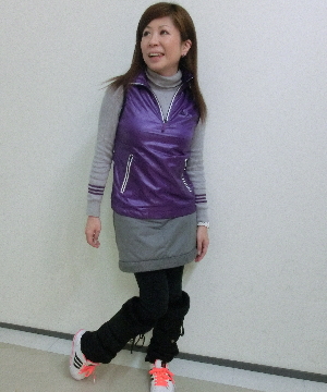 ベースのグレー・黒に対してスモーキーパープル、スモーキーイエローと40代、50代の方が着られる場合、ベースはそのままで上のジャケット・ベストを原色に近いグリーン、ブルー、赤などをもってくるとマイナス5歳ファッションにもなります。また、薄いように見えますが、ヒートテックインナー+チルトの上下+厚手のレッグウォーマーを合わせることによって非常に暖かく動きもスムーズになります。レッグウォーマーがない場合は、ベージュ、オレンジ、茶色などの厚手のタイツをもってきてもおしゃれに見えます。またレッグウォーマーやタイツに代わってパンツをもってくると、よりカジュアル感が出てさわやかに着こなせます。