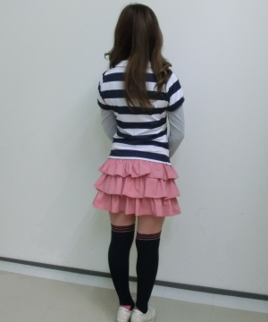 だいぶ暖かくなってきたので春らしい色使いを意識してみました。注目はスカートです。前はフラット、後ろはフリル。前から見る女らしさと後ろから見るキュートさを両立させています。ストライプのポロシャツもスカートのピンクを強調させようと紺色にしました。かわいいだけじゃなくて女らしさも出せるといいけどね!