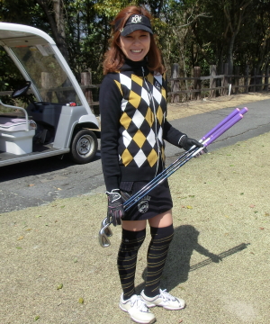 どこから見てもゴルフウェアの王道「ザ・ラウンド」というコーディネイトです。バイザーからハイソックスまで全身が引き締まって見えるクラシックスタイルです。ただ、一つ間違えると地味だったり、暗くなりがちなので注意が必要です。上着の白と黄色のアーガイル柄やワンポイントをあしらったスカート、金のボーダーのハイソックスと憎らしいぐらい大人女子を表現しているスタイルだと思います。