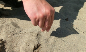 唯一砂に触ることが許されている靴底なら・・・と考えて、足でぐりぐり砂質を調べた。一見、法をかいくぐったうまい作戦のように見えますが、これも砂質を調べる行為となり2打罰が課せられます。