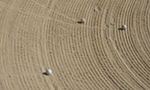 豪快なバンカーショットで砂を巻き上げ近くのプレーヤーの球に砂がかかった場合、かけた方にもかけられた方にもペナルティはありません。かけられた方のプレーヤーは、かぶった砂をどけることができます。砂を触ったからとそのプレーヤーにペナルティを宣言すると喧嘩になるのでやめましょう。