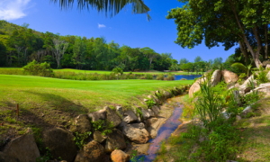 小川の流れがひどくて待っていても球が止まりそうにない。ゴルフは球が止まる前に打つと2打罰を課せられてしまうが、このまま待っても拉致があかない。